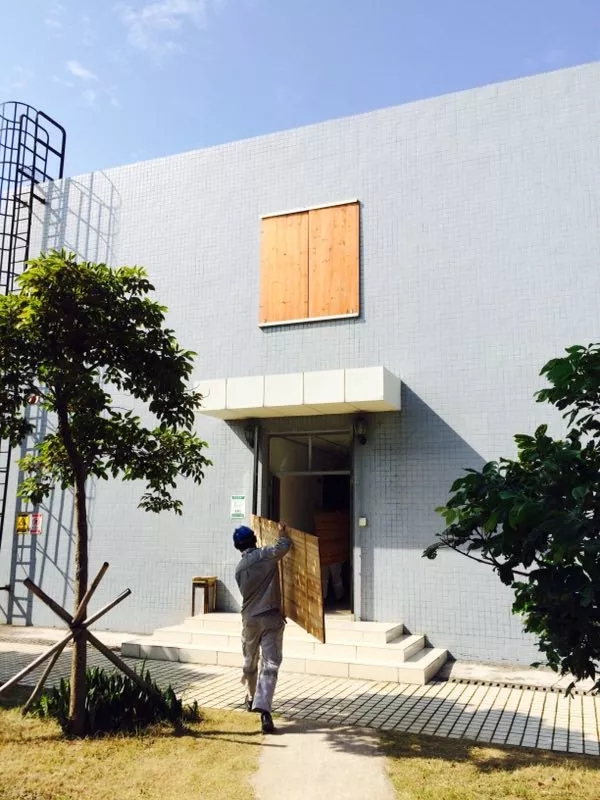 ▲臺風登陸前夕,物業員工加固門窗,防止門窗損壞。