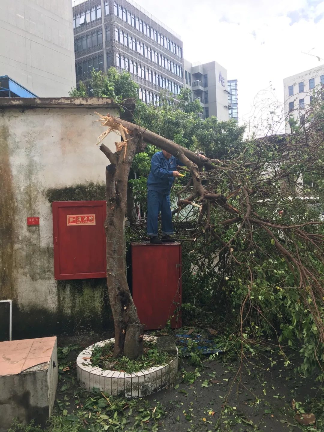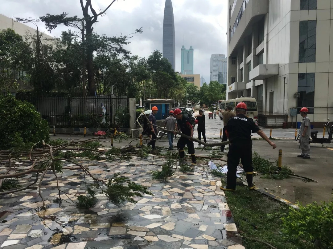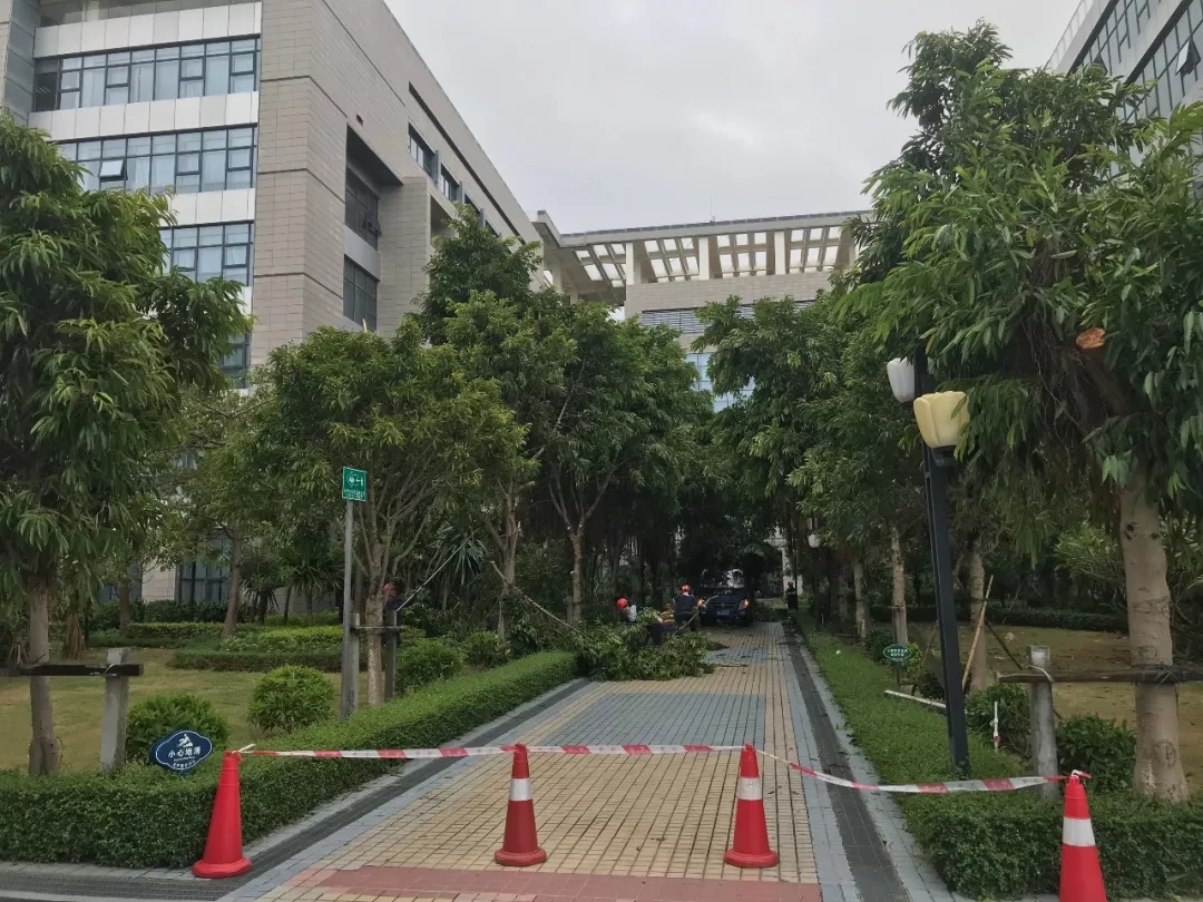 ▲臺風后,陽江分公司物業員工迅速開始清理被臺風吹倒的樹木,保障員工出行。