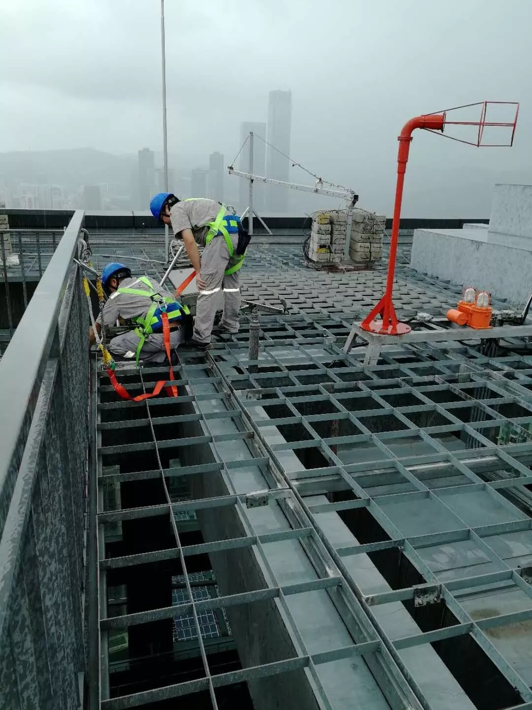 ▲臺風登陸前夕,福田分公司物業員工認真做好高空雜物清理,防止雜物墜落。