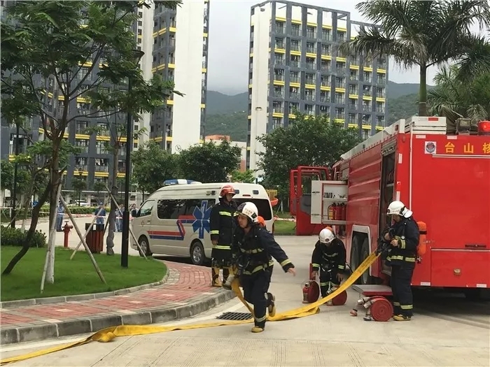 臺山核電基地生活區內,消防員們在揮汗如雨地進行演習訓練。