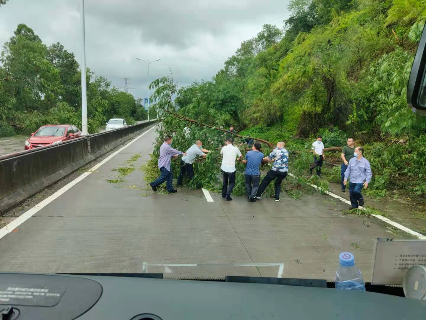 行至半路,狂風吹垮的樹干攔住了前進的道路。車上20余名員工商討過后,決定下車將樹枝挪走。路見不平,車上6名中廣核服消防員率先帶頭下車,進行搬運,并結合日常救援技巧,指引其他同事一同發(fā)力,不一會兒,道路中間的“攔路虎”就被大家都轉移到路邊。去程50公里的路程,中途停車清理了5次大型的樹枝,掃清了道路障礙,讓周邊生活、工作的群眾可以順利出行。
