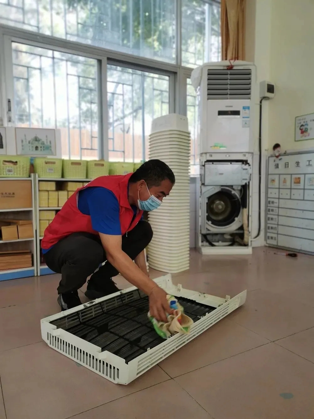 “紅馬甲”們圓滿完成了28臺空調的清洗