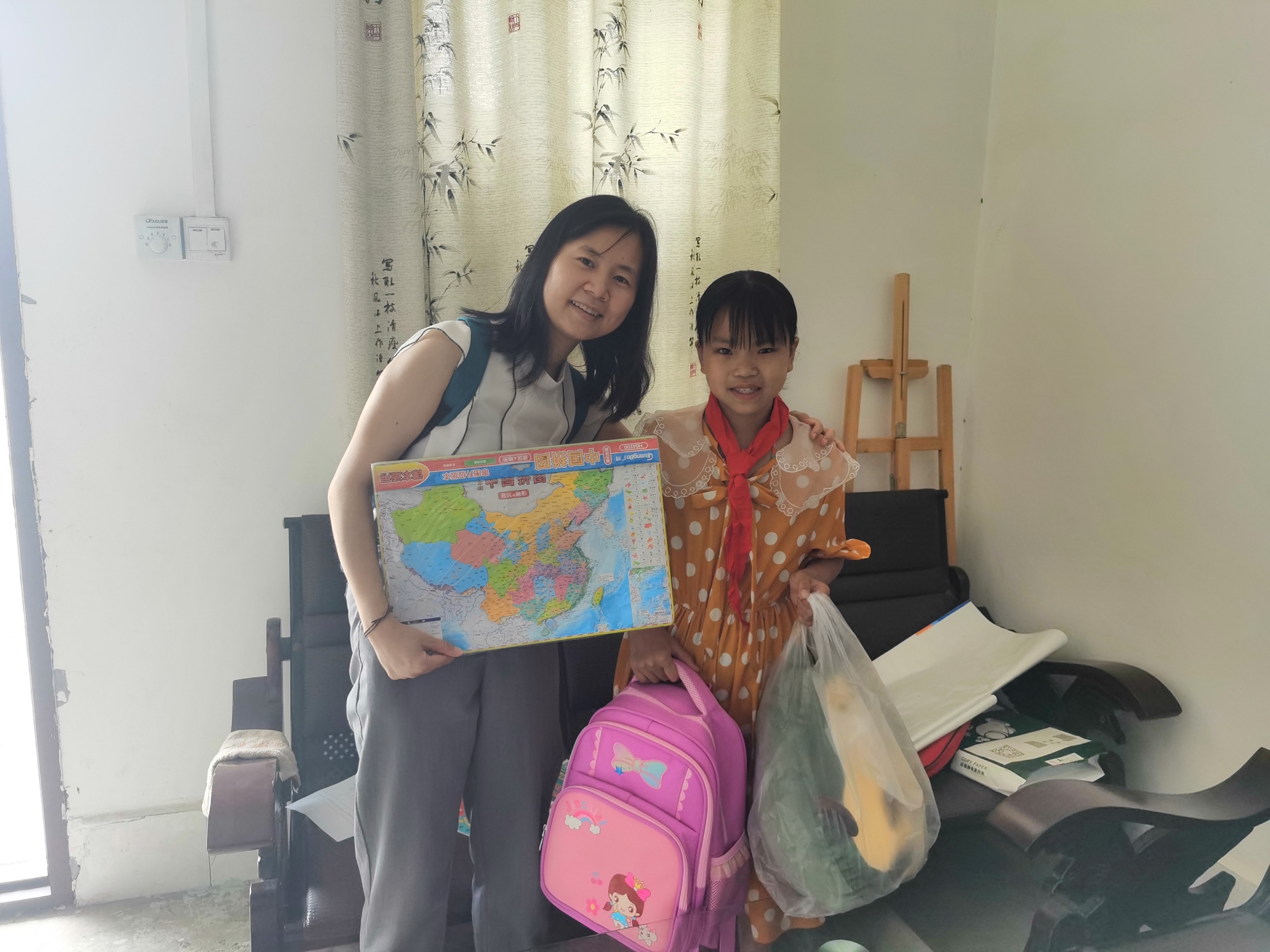 大家前往覽金小學看望“彩虹計劃”一對一幫扶貧困學生盤秀蘋,為其送去書包、文具、玩具、中國磁力地圖等六一節禮物,與其進行友好互動,了解其近期學習和生活情況。